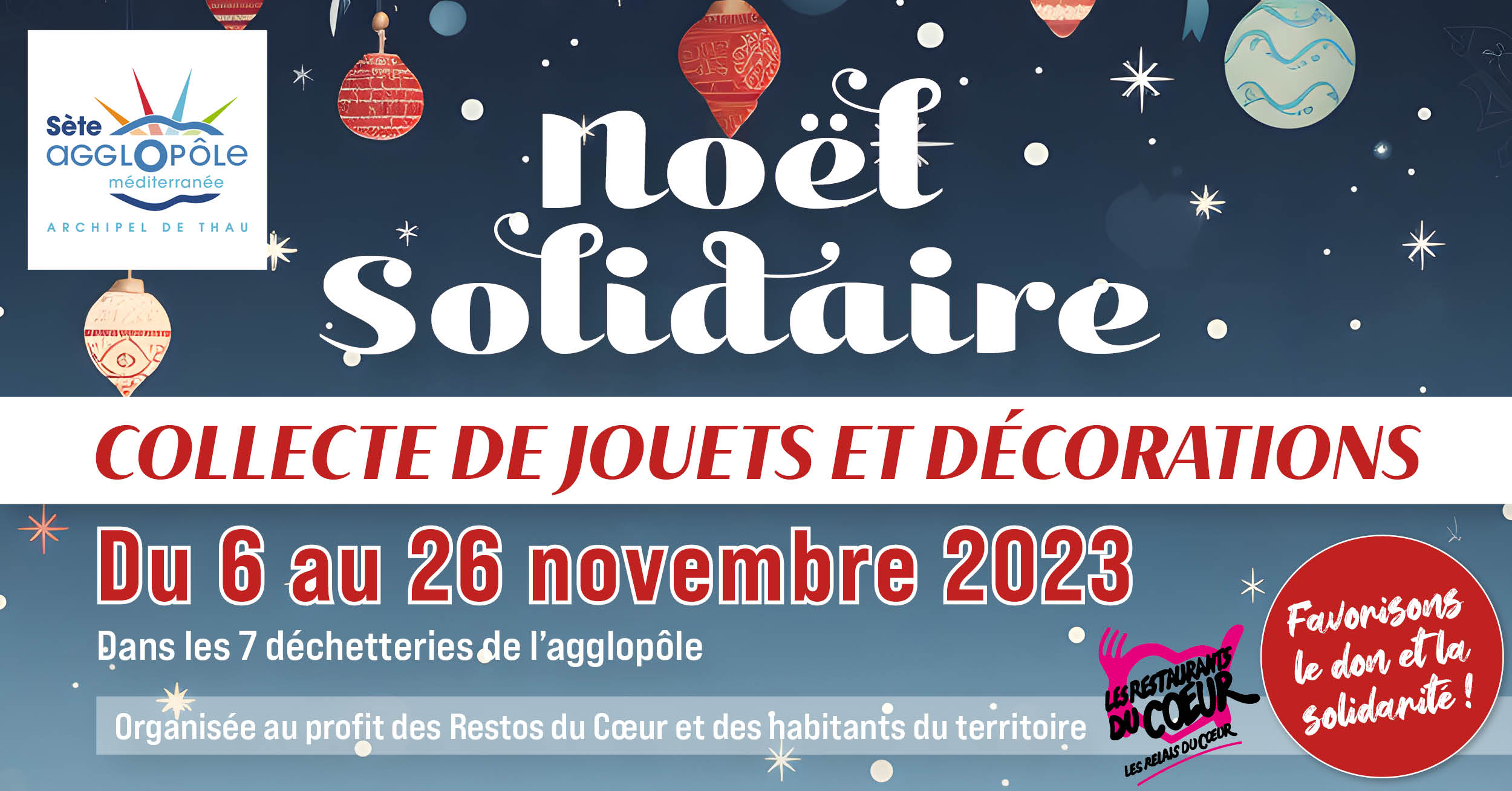 Retour aux événements Agglo de Sète – Noël solidaire collecte 2023 Du 06/11/2023 au 26/11/2023 + Ajouter au calendrier Récapitulatif Date et heure Du 06/11/2023 au 26/11/2023